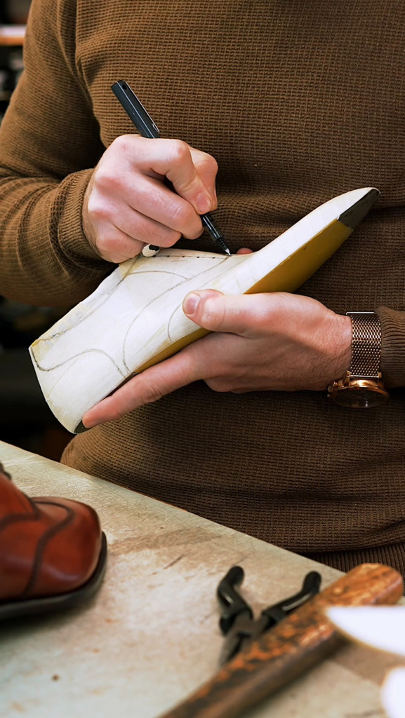What it means is that the sole is stitched to the bottom of the shoe – unlike 99.9 per cent of all footwear made in the world, where they just glue the sole on, and you can’t repair it later. But with Goodyear welted shoes, when you eventually wear through the sole, we can cut through the stitching, put the shoe back on the original wooden ‘last’ [mould] and rebuild it to the original specification. So if you invest in a decent pair of shoes, they will last you a long, long time.